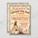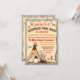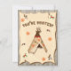 Rustic American Indian birthday party pow wow sleepover invitations with hand painted teepee, campfire and fun typography on a animal skin cloth against a wood panelled background. Great for a girl or boy slumber or camping party. Hand drawn illustration by McBooboo.