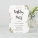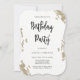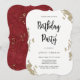 Chic and modern birthday party invitation with stylish typography on the front and elegant red with faux gold marble on the back of the card.