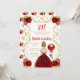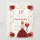 This birthday party invitation features an elegant gold frame, a beautiful princess with red hair and a red dress, flowers and a balloon. This is perfect for a birthday party.