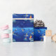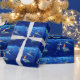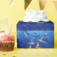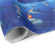 Wrapping Paper shown with a photo print of sharks in the deep sea with their Birthday party hats on. A tone on tone deep Sea Blue text reads "Happy Birthday". See our Birthday gift tags link for peel & stick gift tags to coordinate with this paper. Customise this paper or just buy as is. Stock Image