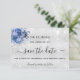 A girly and trendy Save the Date for a 50th (or any age) birthday party. A classic faux silver metallic looking background decorated with faux silver glitter dust and blue flowers. Personalize and add a date and name/age. The text: Save the Date is written with a large trendy hand lettered style script.