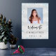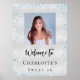 A welcome poster for a 21st (or any age) birthday party. Personalise and add a photo, a name and age. A faux silver background and blue faux glitter, sparkles.