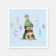 Happy birthday greetings with this cute design featuring a cute, party hat-wearing Yorkshire Terrier puppy surrounded by colourful streamers.
