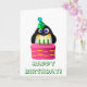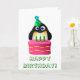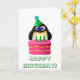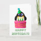 A cute cartoon penguin with a green spotted party hat, and a big pink birthday cake lit by three green candles.