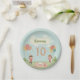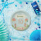 A soft, sweet, and nostalgic illustration design depicting a cheerful birthday celebration outdoors. The illustration features smiling children with party hats, a small cake on a checkered picnic blanket, gifts, and colorful balloons. The top section includes a blank space for adding a name, age, or event details. The balloons are styled as numbers. The overall style is colorful, retro-modern, and warm, perfect for any children's event or age celebration.