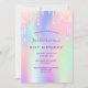 A girly and feminine 21st (or any age) birthday party invitation. On front: A holographic coloured background in purple, pink, mint green. Decorated with drips in purple, pink and faux gold. Personalise and add a name and party details. The name is written with a hand lettered style script, purple coloured letters.