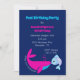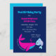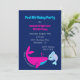 Colourful birthday / pool party invitation done in dark blue with cute graphics of a pink whale and a light blue and pink fish, at the bottom. Personalise the custom text fields to suit your party needs.