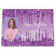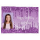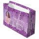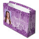 A gift bag for a girly and glamourous (any age) birthday. A purple gradient background with deep purple faux glitter drips, paint dripping look. White hand lettered style script and the text: Happy Birthday. Personalise and add 2 different photos, name.