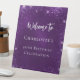 A welcome sign for a girly and glamourous 40th (or any age) birthday party. A deep purple background decorated with faux glitter, sparkles. The purple colour is uneven. Personalise and a name.