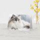 A fluffy Ragdoll cat with striking blue eyes reclines on a soft white rug.