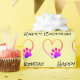 Neon rainbow pet paw print with heart and Happy Birthday text on yellow background.