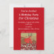 This flat card party invitation is vibrant red with a vintage image of little red riding hood in a red hooded cape picking red and black flowers from a field with the wolf off in the distance behind her. Customise all your information with the templates.
