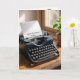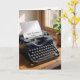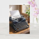 A retro black typewriter perched on a polished wooden desk, basking in the warm sunlight streaming through a nearby window, while a vibrant potted plant adds a touch of life to the scene.