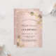 A blush, rose gold gradient background decorated with golden eucalyptus and faux sparkles. Personalise and a name and party details. Black coloured letters.