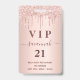 A modern, stylish and glamourous badge for a 21st (or any age) birthday party. A faux rose gold metallic looking background with an elegant faux rose gold glitter drip, paint dripping look. With the text: VIP. Personalise and add name, age, address/date. The name is written with a modern dark rose gold coloured hand lettered style script with swashes.