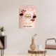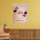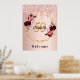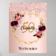 For a 50th (or any age) birthday party. A rose gold faux metallic looking background with a faux gold geometric frame. Decorated with dark purple and burgundy flowers, roses, boho style feathers and faux glitter drip, paint dripping look. Personalise and add a name and age 50. The name is written with a hand lettered style script. With the text welcome.