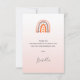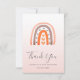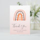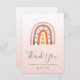 A thank you card for a 21st (or any age) birthday. A rose gold and white gradient background. Decorated with a modern abstract, minimalist painted rainbow with hearts in grey and rose gold and orange. On front large grey coloured hand lettered script and the text: Thank You, your text, title and a date.