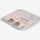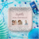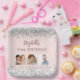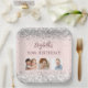 For a girly and glamourous 50th (or any age) birthday party. A rose gold gradient background decorated with faux silver confetti. The text: The name is written in dark rose gold with a large modern hand lettered style script. Personalise and add name, age 50 and 3 of your own photos of the birthday girl, her family, friends or pets.
