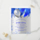 A girly and feminine 18th (or any age) birthday party invitation. On front: A faux silver background. Decorated with royal blue faux glitter drips, paint dripping look and balloons. Personalise and add a name and party details. The name is written with a hand lettered style script.