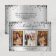 Add 3 of Your birthday photos, vertical size, a date, name, and the thank you note. A faux silver metallic looking background with black text and frame, black faux glitter sparkles. The text: Thank you on the front and your name on the back are written with a stylish hand lettered script with swashes.