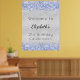 A welcome board for a girly and glamourous 21st (or any age) birthday party. A faux silver looking background decorated with blue faux glitter. Personalise and add a name and age. Black letters.