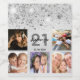 For a 21st (or any age) birthday party, celebrating her life with a collage of 5 of your own photos. Personalise and add a name, age 21 and a date. Date of birth or the date of the party. Black and grey coloured letters. A faux silver metallic looking background, decorated with faux glitter dust