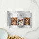Add 3 of Your birthday photos, vertical size, a date, name, and the thank you note. A faux silver metallic looking background with black text and frame, faux glitter sparkles. The text: Thank you on the front and your name on the back are written with a stylish hand lettered script with swashes.