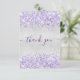 A feminine and elegant birthday thank you card. A faux silver metallic looking background colour. With purple, violet faux glitter dust. On front large hand lettered script and the text: Thank You.