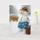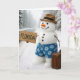 A hitchhiking snowman, wearing a straw hat and a swim trunks, holds a 'Florida' sign by the snowy roadside, while a nearby suitcase adds a whimsical travel theme to the winter scene.