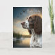 A springer spaniel dog with a brown and white coat gazes thoughtfully over a serene wetland landscape at dawn, where ducks take flight amidst tall reeds.