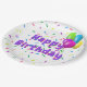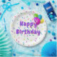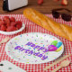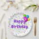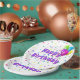 Happy Birthday text on white background with colourful candy sprinkles and balloons.