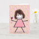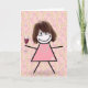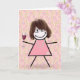 Smiling stick girl with a wine glass, hair, glasses pearl necklace on a pink floral background for birthday.