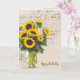 Bright yellow sunflower bouquet in glass vase on brick wall abstract for birthday.