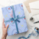 This swimming-themed wrapping paper has dark blue text that can be edited for your preferred greeting, or you can use: "HAVE A SWIMMINGLY GOOD BIRTHDAY". The design shows a pictogram swimmer carrying a present through the waves, and wearing a party hat. The background is pale blue, and there are extra yellow stars.