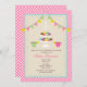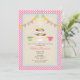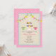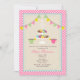 A birthday party invitation featuring a tea party theme. Invite has an illustration of a two tiered stand of French macarons at top with a pink and green teacup with lemon on either side. Personalise with age at top of stand. Invite also features solid and gingham bunting at top and a pink gingham background. Personalise the text with details of your occasion.