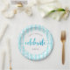 “Happy birthday”. Here’s an unique addition to your birthday fête! “Celebrate” with this stunning, modern, sparkly turquoise blue glitter dots and typography script against a baby turquoise blue and white striped background, paper plate for an event to remember. Personalise the custom text with your guest of honour’s name. Your choice of 2 sizes: 7” or 9”. Guaranteed to add stylish fun to her special party! Matching and coordinating invitations, napkins and other birthday goodies are also available in this trendy and special collection.