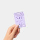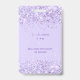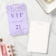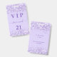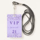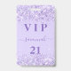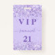 A modern, stylish and glamourous badge for a 21st (or any age) birthday party. A violet background with violet, lavender coloured confetti. With the text: VIP. Personalise and add name, age, address/date. The name is written with a modern hand lettered style script with swashes.