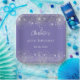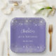 A stylish violet background with elegant faux silver glitter, sparkles. The text: The name is written in white with a modern hand lettered style script. Personalise and add a name, age and a date.