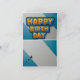 A festive birthday card featuring a classic birthday cake with colourful frosting and lit candles. Five brightly coloured balloons with curling ribbons float above the cake. The background is a clear blue sky. On the inside image of card has a blue background with the text “HAPPY BIRTHDAY” in a block font.