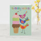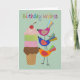 This is a birthday card with four scoops of ice cream in a waffle cone and a cherry on top. Next to the cone is three folk art birds standing on top on each other to reach the ice cream.