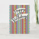 This is a fun Birthday card for anyone that has colourful solid and pattern stripes. The text says ‘Happy Birthday’ over white curved banners.