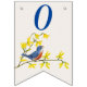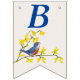 This flag shaped bunting Happy Birthday banner is white with a cute little singing blue and red bird standing on a branch with pretty yellow flowers. Customise the birthday year with the templates.
