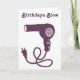 This greeting card features a simple hand-drawn style illustration of a vintage hairdryer in purple. This card is ready to be customised with your own message on the front and the inside in orange script lettering so that you can create a funny card for birthdays or any occasion.