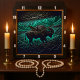 This illustration features a dark, tooled neon colour leather background with a stylised bison in a field. A mountain range is visible behind it, all rendered in shades of glowing teal and dark blue. The embossed texture gives the artwork a unique and striking appearance, emphasising the contours of the landscape and the bison.