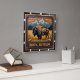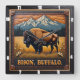 This illustration is a tribute to the American West, with a stylised bison in a grassy field. The background features a mountain range under a vibrant sunset. The artwork is given a distinctive, tooled leather texture and a decorative border. The words "BISON,, BUFFALO" are at the bottom.