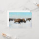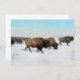 It shows a large herd of bison walking through a winter landscape. The ground is completely covered with snow, so the landscape is almost entirely white. Bison are bovine creatures, similar to cows, and they are large even-toed ungulates. Bison are often called buffalo, but the animals are not closely related to African buffalo or water buffalo. The European bison is also known as wisent. Bison have brown fur and pointed horns. The original art was painted by Rosa Bonheur in 1897.