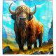 This shower curtain has a cartoon bison pictured on it.