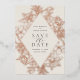 An elegant save the date design featuring your wedding details in chic charcoal lettering, nestled in a diamond shaped geometric element. An intricate floral border of rose gold foil lilies and foliage pops against a warm cream ivory background.