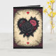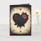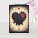 A bold, gothic, inky-black heart edged with a delicate trim. Nestled inside that heart are two roses. Tiny red buds and dark leaves spill around them, creating a dramatic contrast with the softness of the petals. The overall mood is richly romantic with a dark, bittersweet edge. An ornate border frames everything: curling vines, thorny filigrees, and symmetrical corner flourishes in deep red and black that feel both decorative and slightly menacing. Small red hearts punctuate the design above and below the central motif