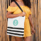 Personalize this nautical chic black and white striped tote bag with your double initial monogram on a summery turquoise aqua circle badge. Design features a band of wide horizontal black stripes across the bottom, topped by an aqua nautical anchor badge flanked by your initials. Stripes repeat on reverse.